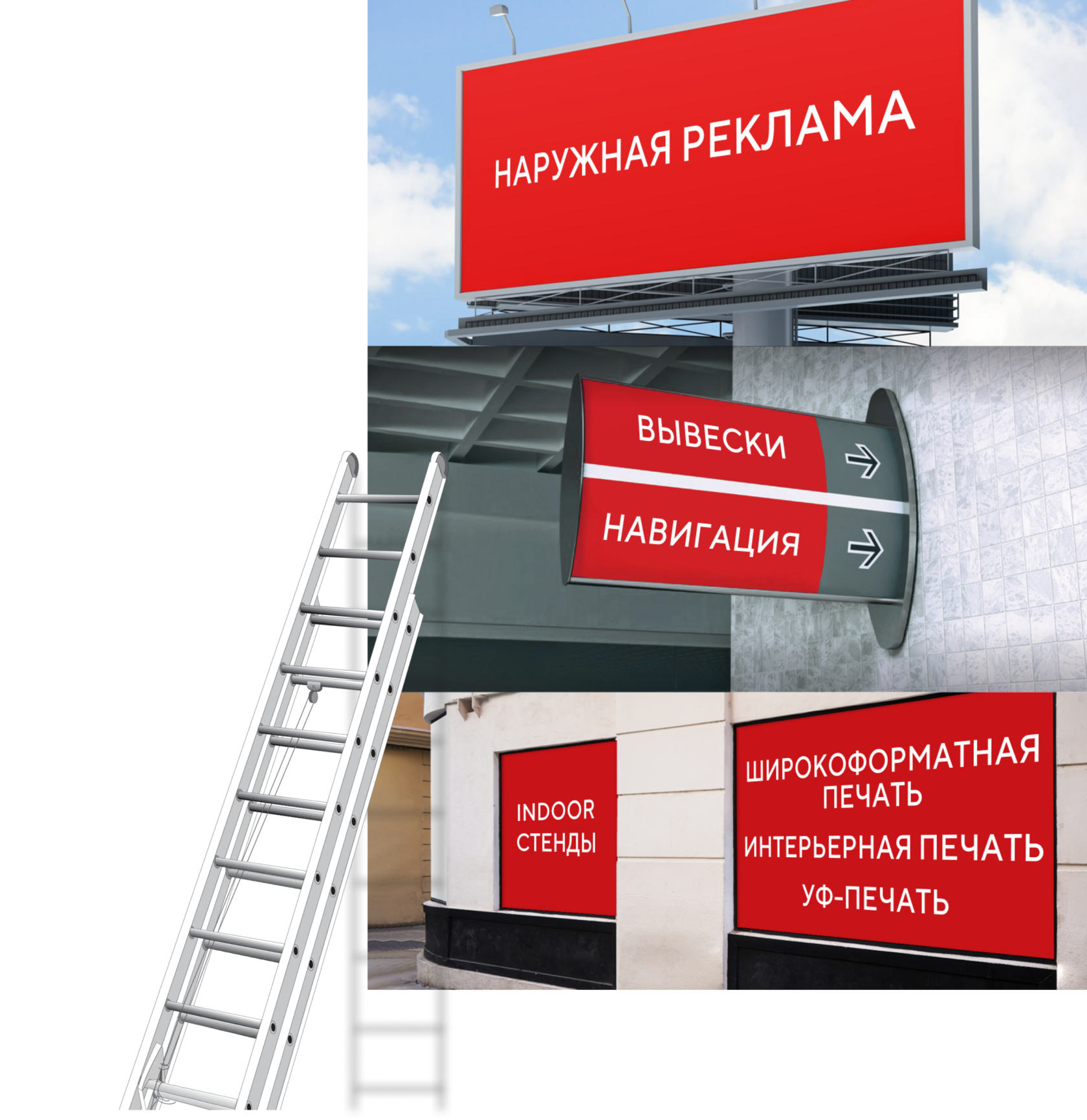 — Все виды наружной рекламы, навигации. У нас вы можете заказать практически все виды наружной рекламы и навигации, оформление витрин, фасадов, интерьеров и т. д. – и все это в одном месте!